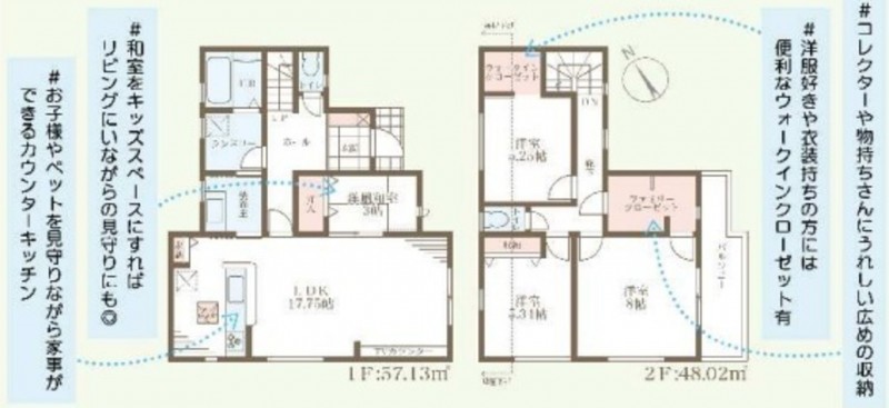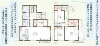 | 設備・条件 | システムキッチン、カウンターキッチン、IHクッキングヒーター、オール電化、シャンプードレッサー、洗浄便座、浴室乾燥機、ウォークインクローゼット、モニタ付インターホン、1BOX駐車可、駐車場2台分、床下収納、トイレ2箇所、角部屋、一建設施工、住宅性能6項目で最高等級取得、長期優良住宅認定物件、省エネ、地盤サポート20年保証、10年後の無料点検 | ||