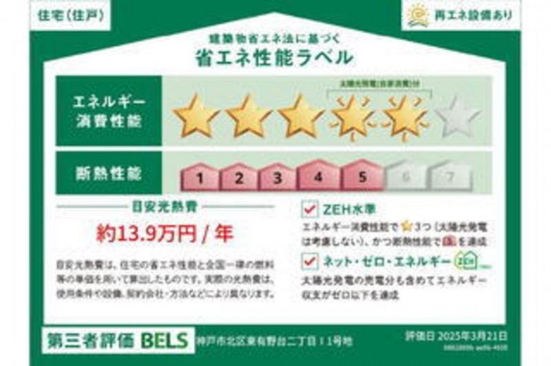 | 設備・条件 | 側溝、システムキッチン、カウンターキッチン、食器洗浄乾燥機、シャンプードレッサー、洗浄便座、浴室乾燥機、モニタ付インターホン、1BOX駐車可、駐車場2台分、トイレ2箇所、エストコーポレーション施工、セセラの家(ZEH水準)、断熱等級5、耐震等級3、太陽光パネル4.5KWH、全熱交換型第1種換気システム、LDKにエアコン付き | ||